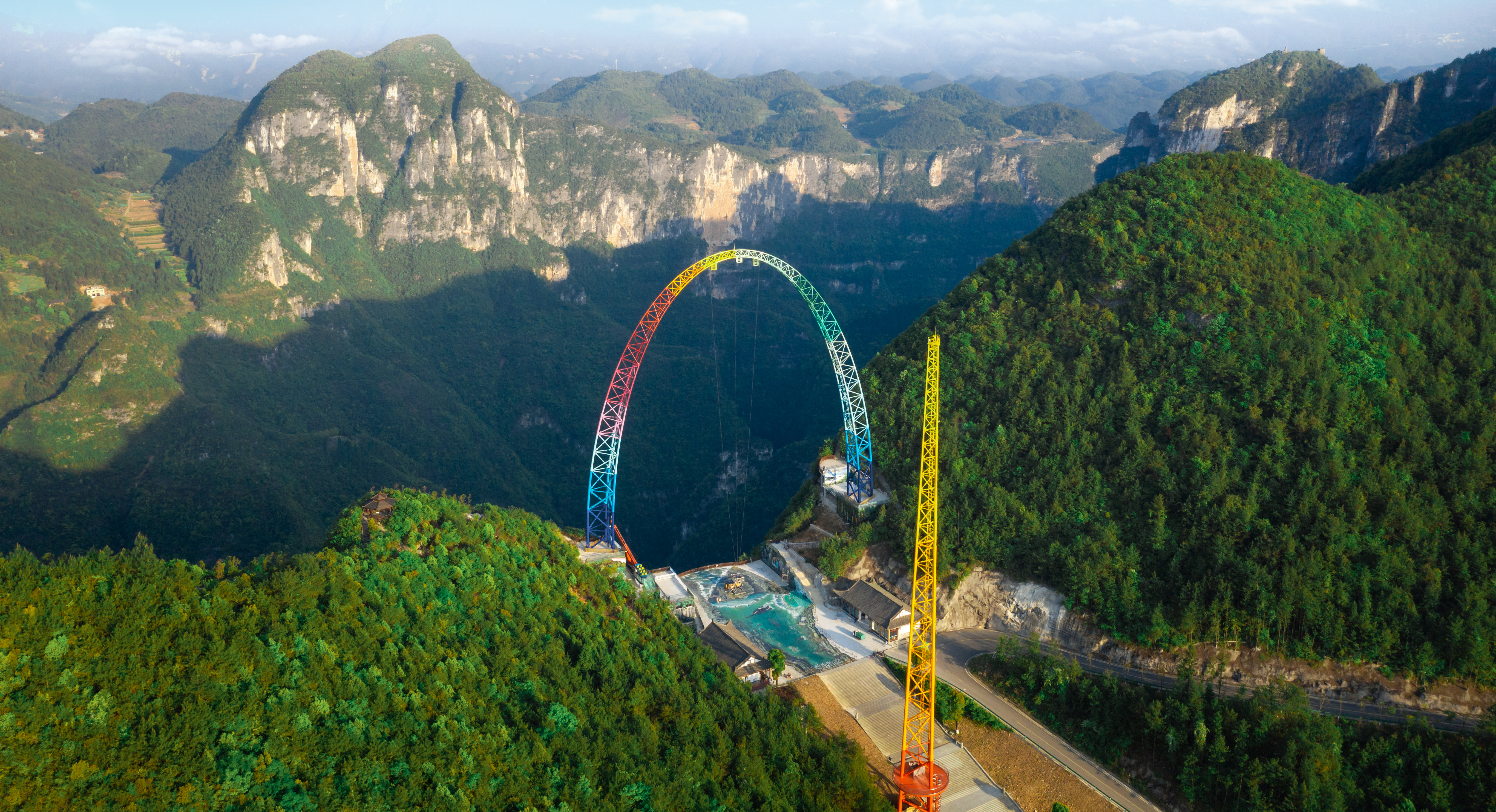 由中冶設(shè)備院自主研發(fā)、設(shè)計、制造、安裝的云端彩虹秋千,坐落于重慶龍缸5A景區(qū)700米的懸崖邊緣,主體由高100米、基礎(chǔ)跨距87.6米的彩虹涂裝拱形塔和高108米的提升發(fā)射塔等部分組成,該設(shè)備最大提升高度88m,最大運行速度可達130km/h,以“世界最高的框架秋千”稱號被載入吉尼斯世界紀錄。
